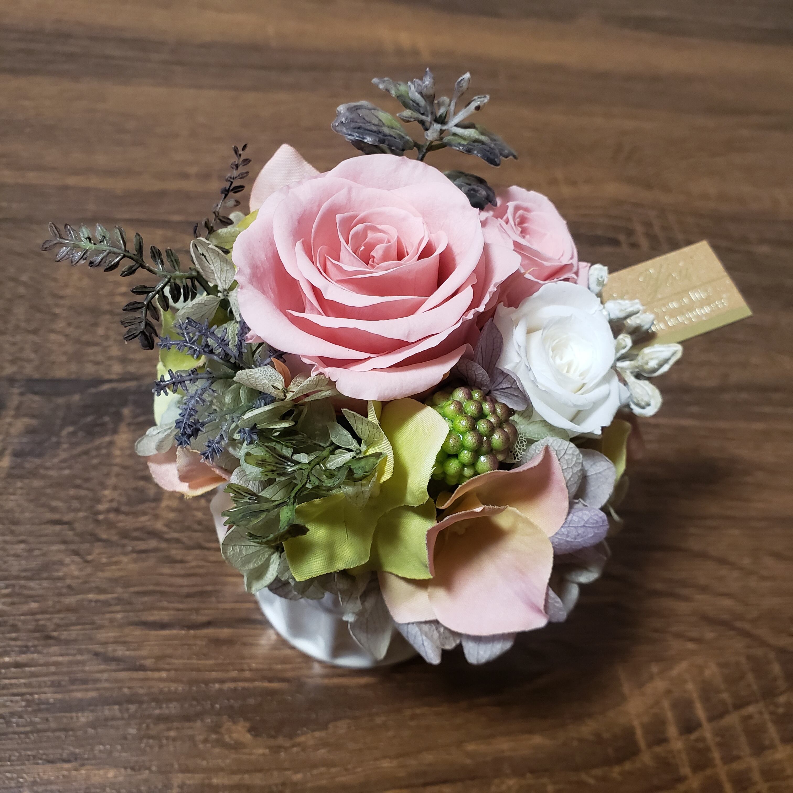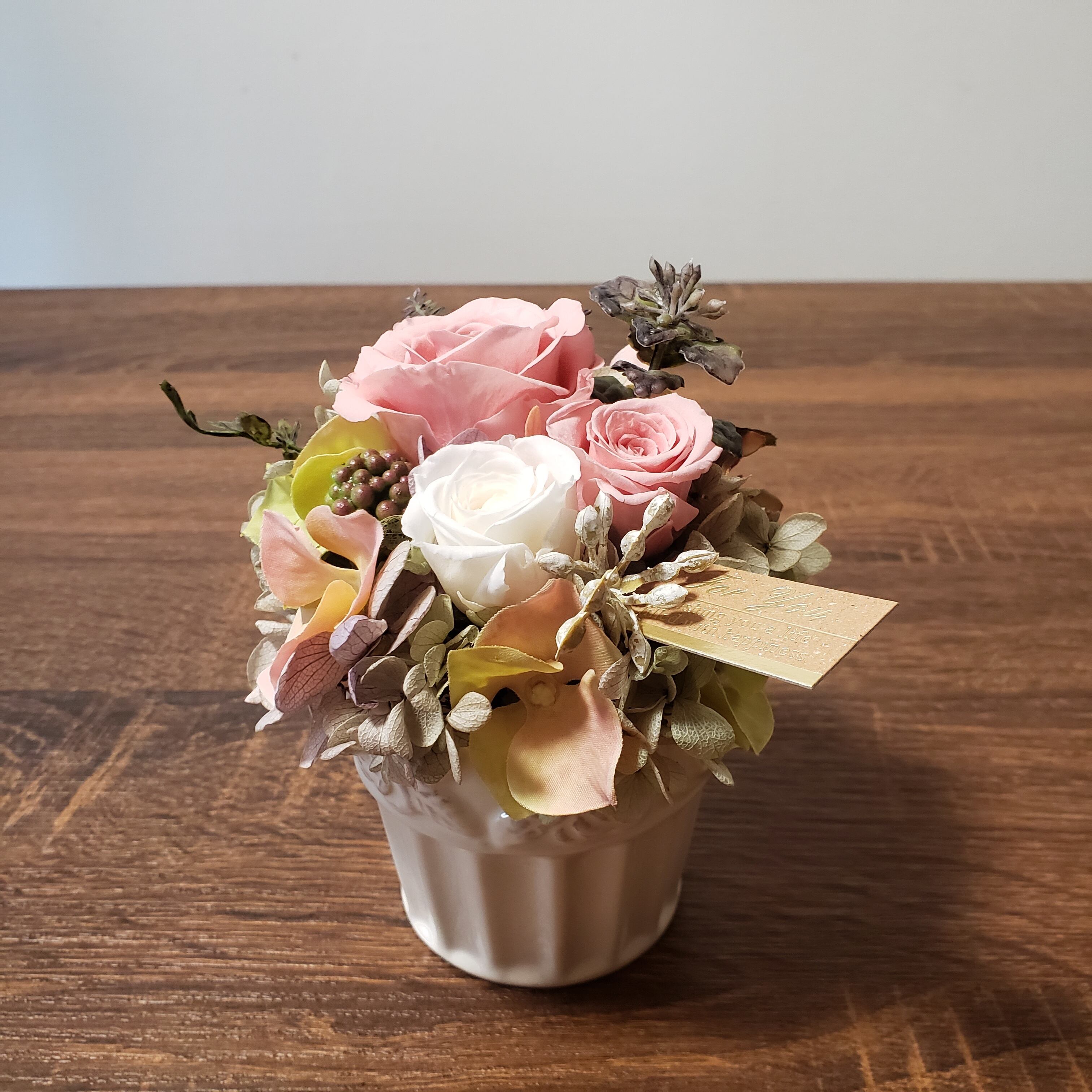白い陶器もとても上品なプリザーブドフラワーアレンジメントです。