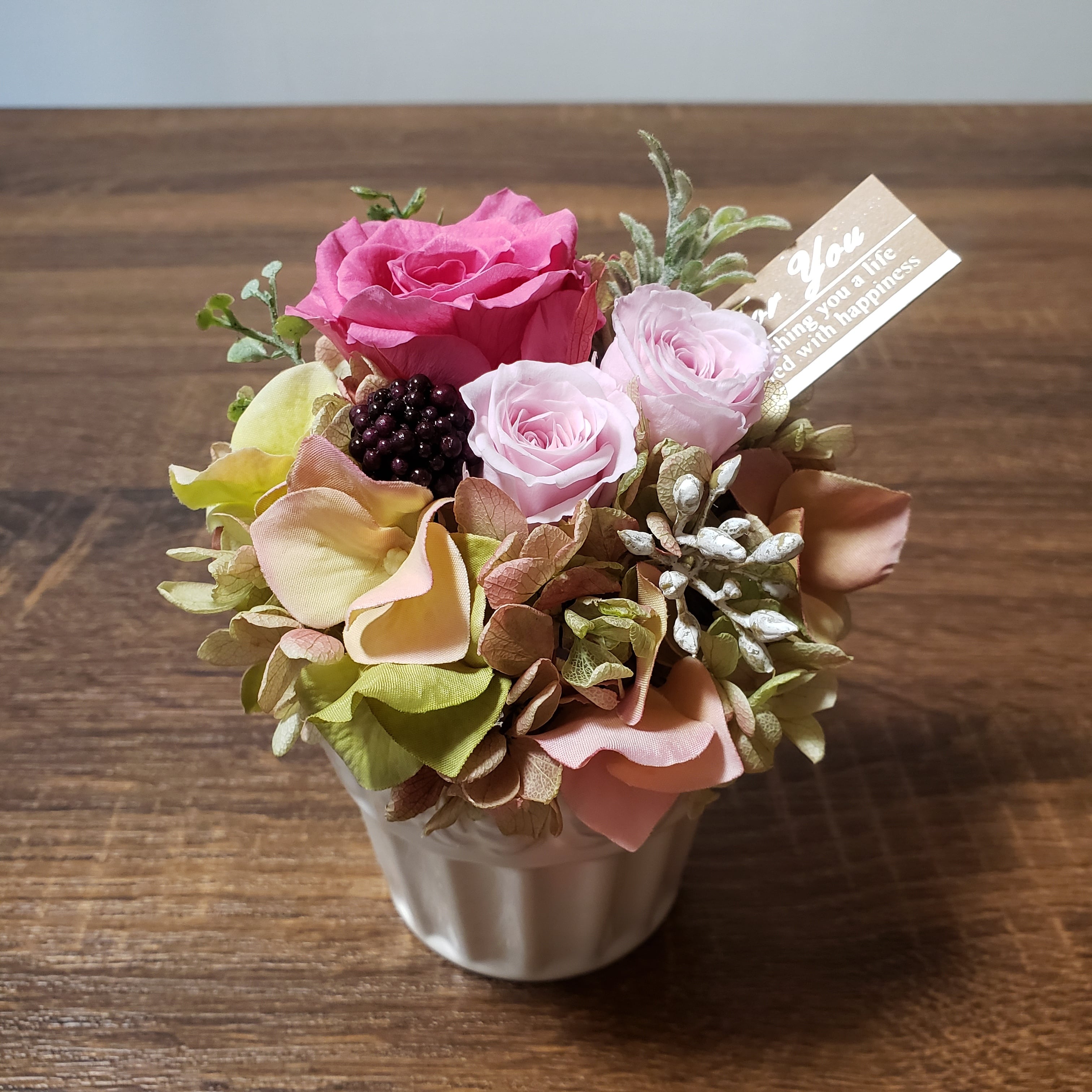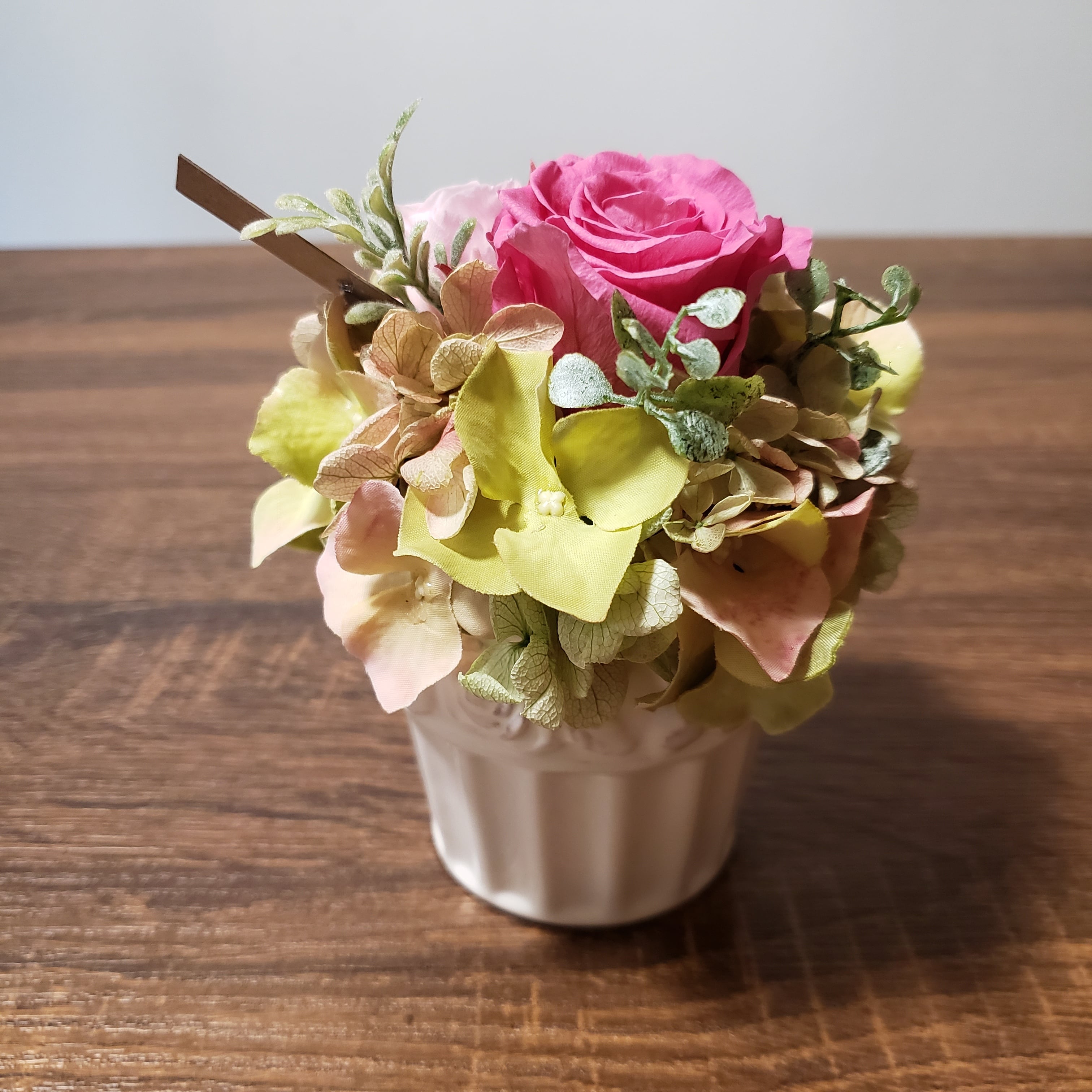 インテリアとしてもお部屋のアクセントになる明るい色合いで、白い陶器ととても相性の良いプリザーブドフラワーアレンジメントです。