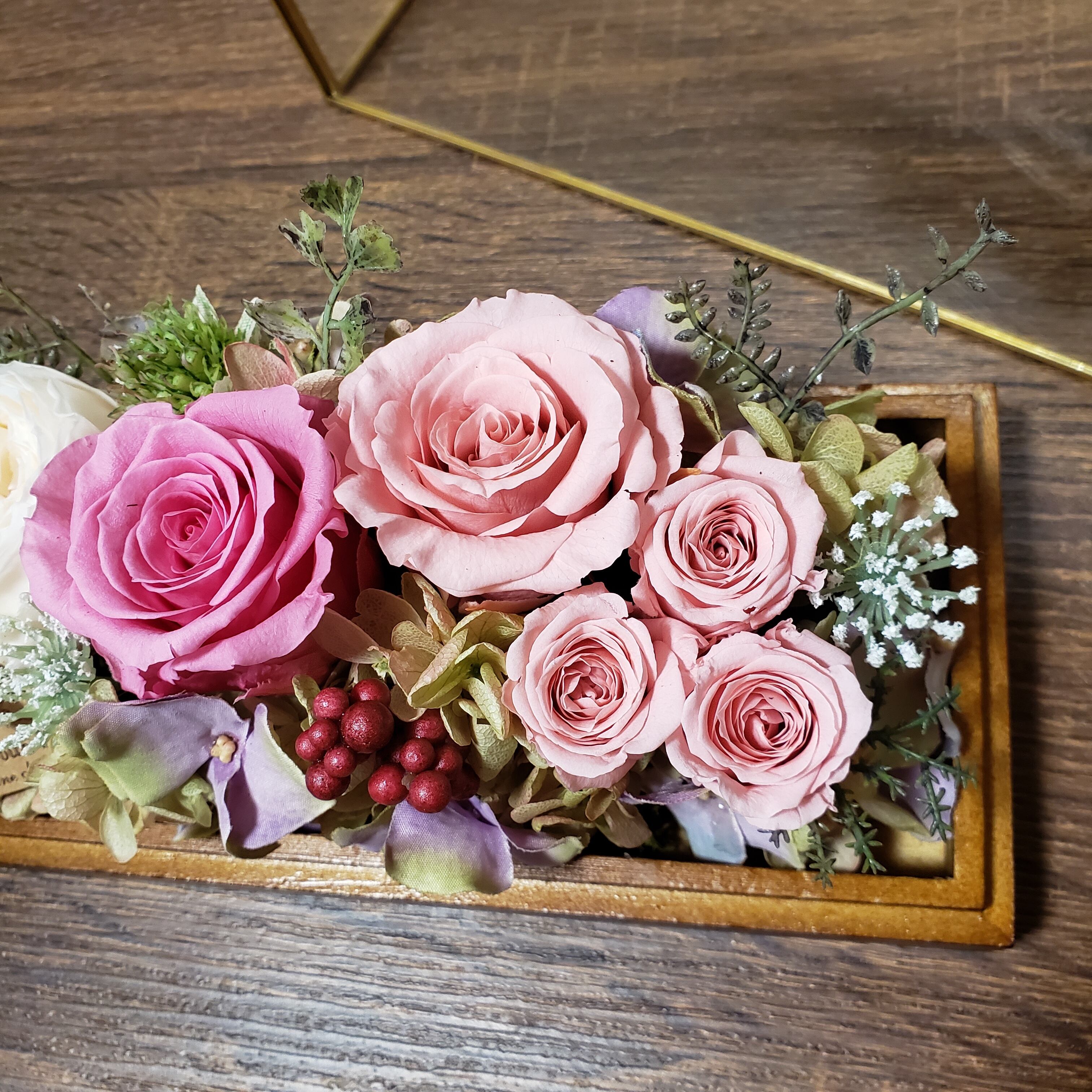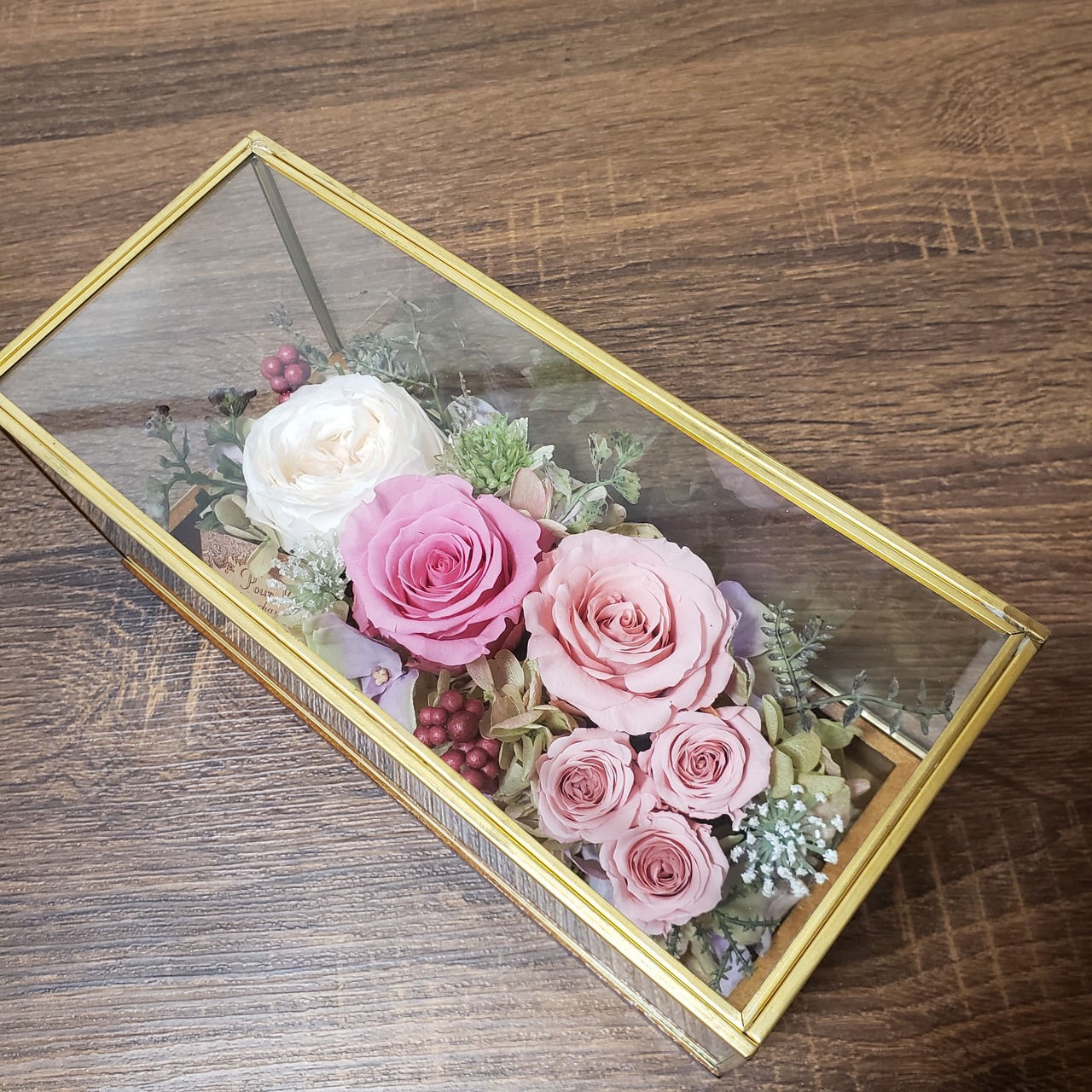 高級感のあるガラスケースにプリザーブドフラワーをアレンジメントしました。