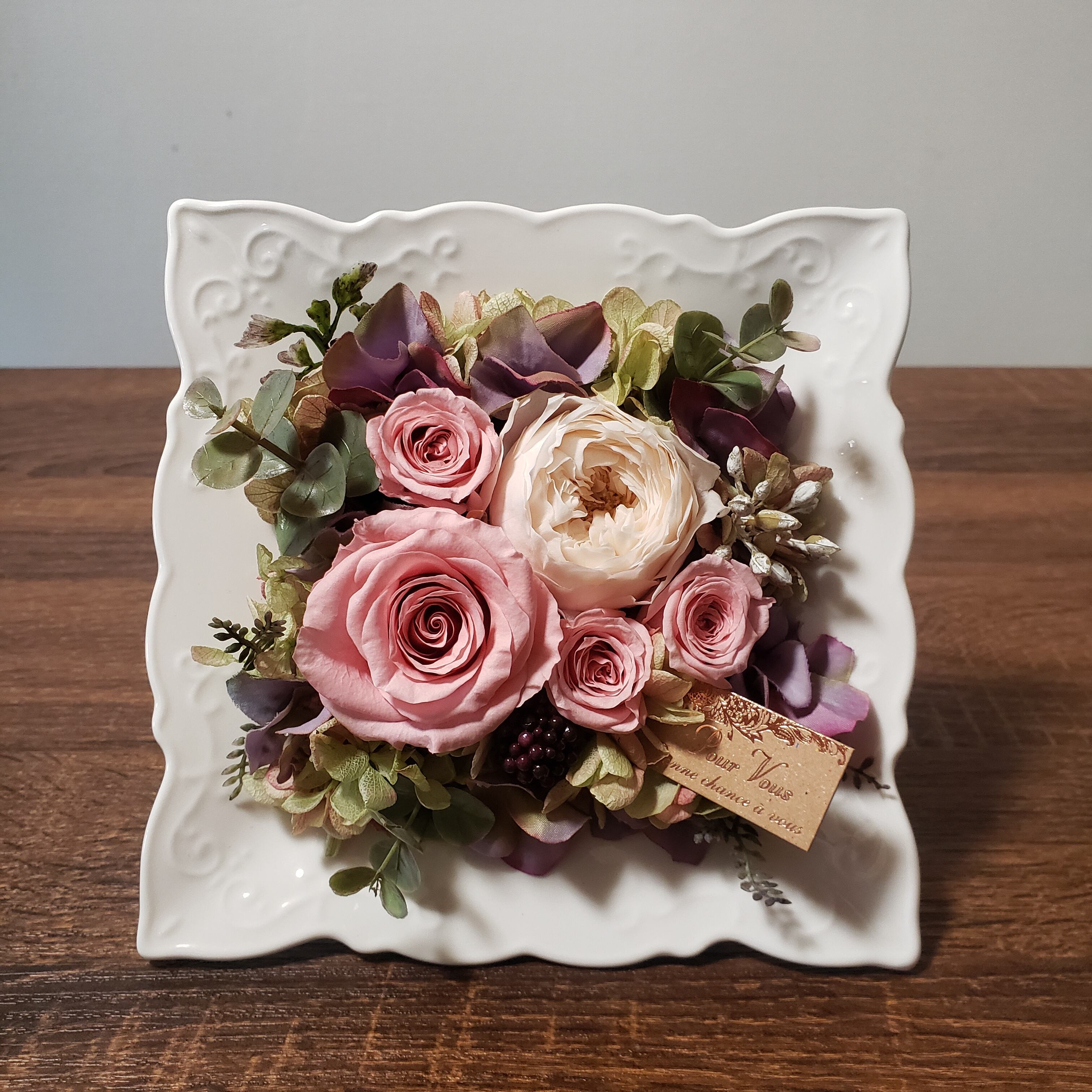 立て掛けて飾れるアンティーク風のバニラピンクアレンジメント【プリザーブドフラワー】