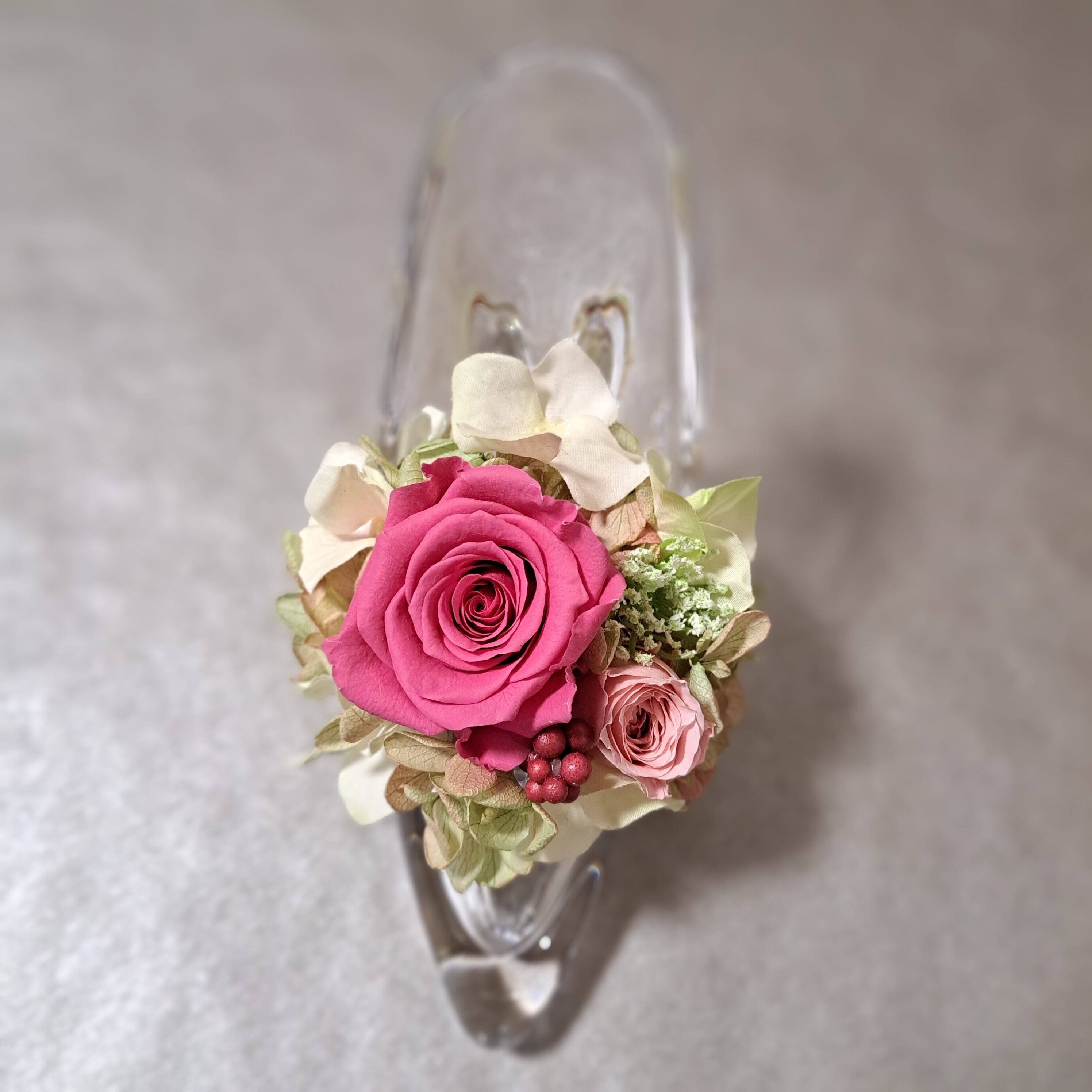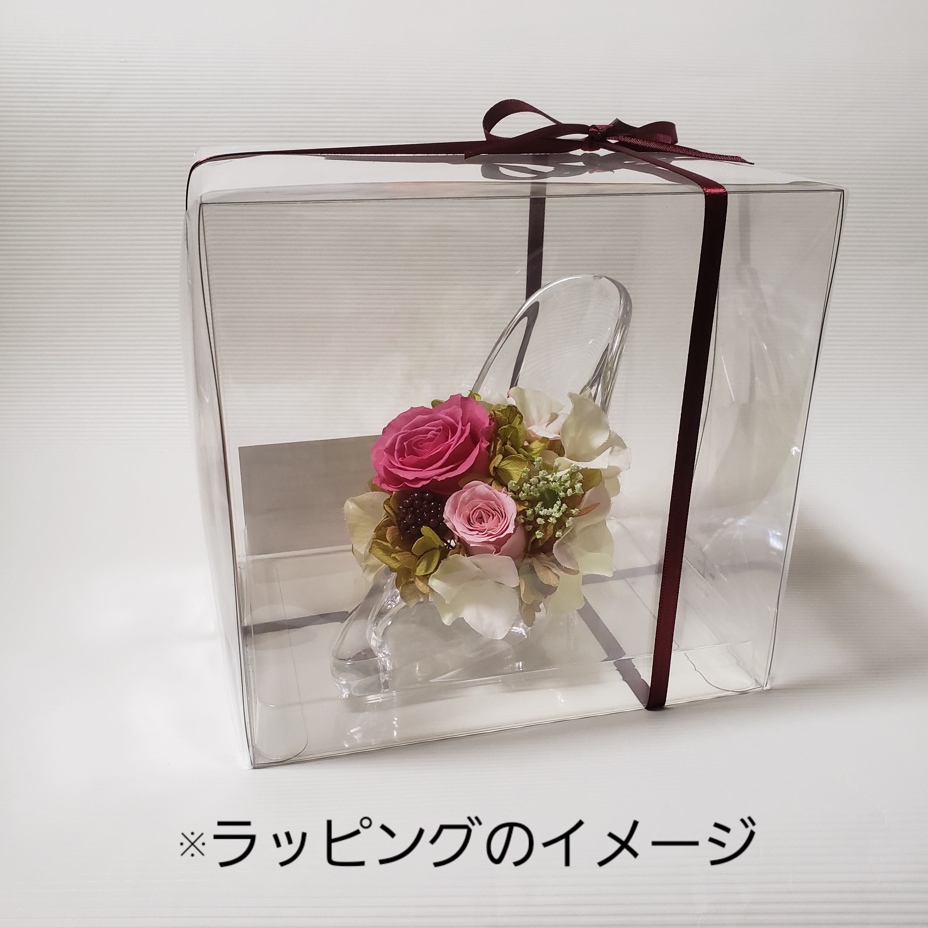 ケース付き プリザーブドフラワー シンデレラのガラスの靴モチーフアレンジメント ピンクローズ