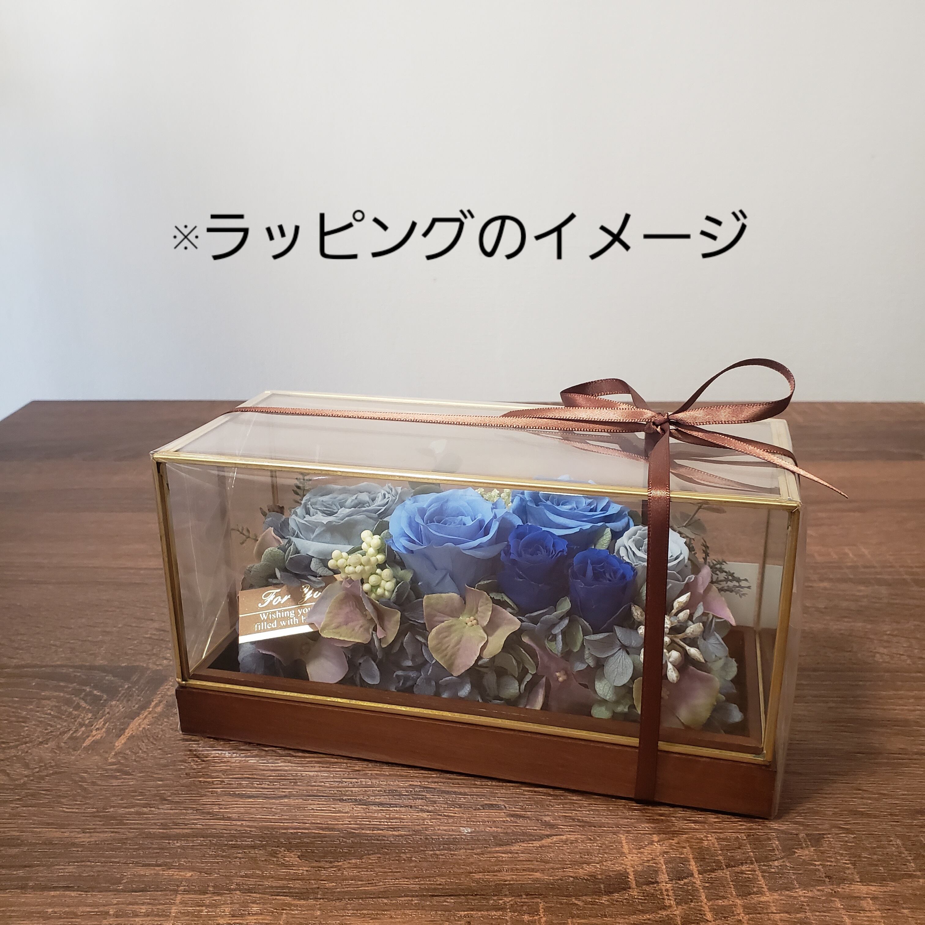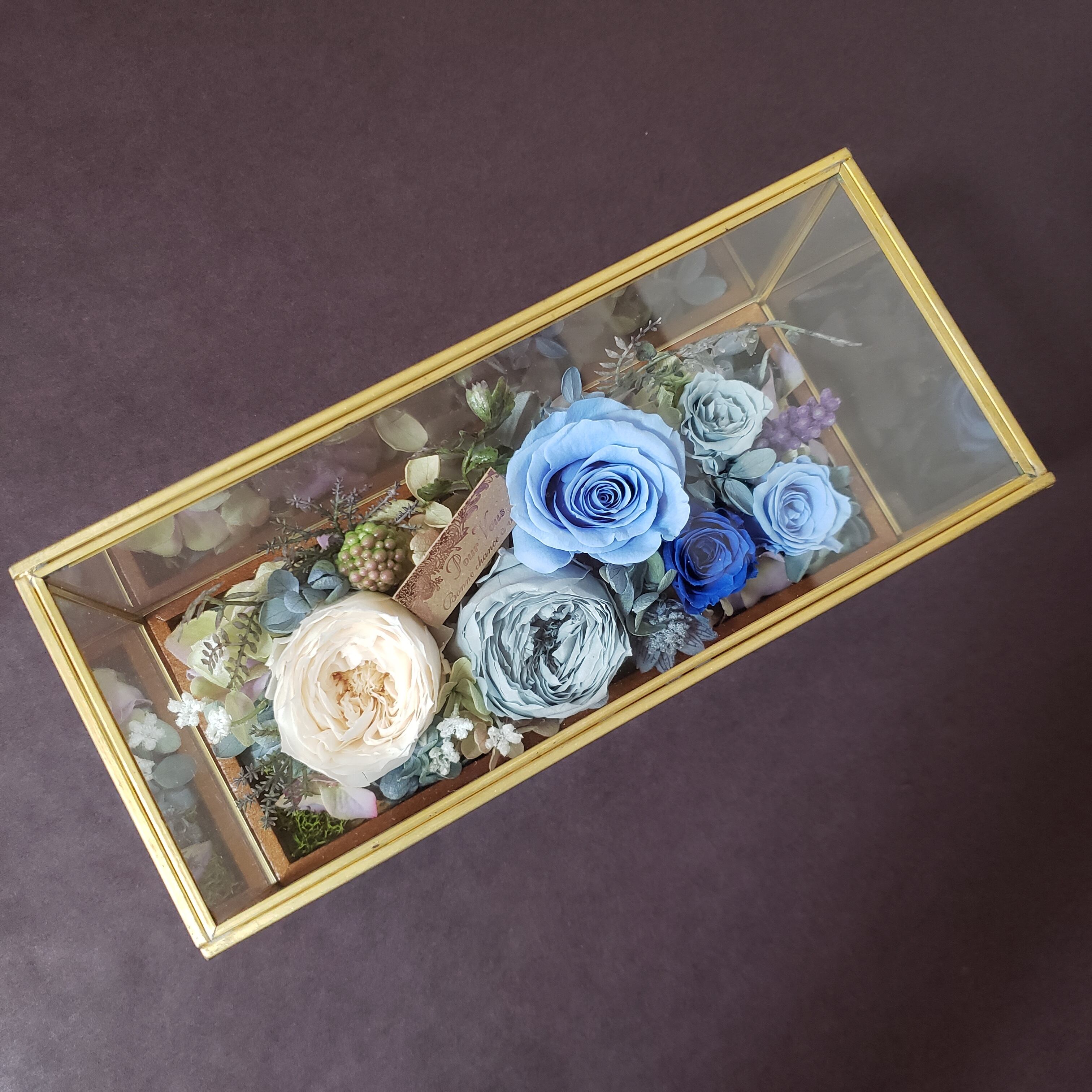 高級感のあるガラスケースにプリザーブドフラワーをアレンジメントしました。